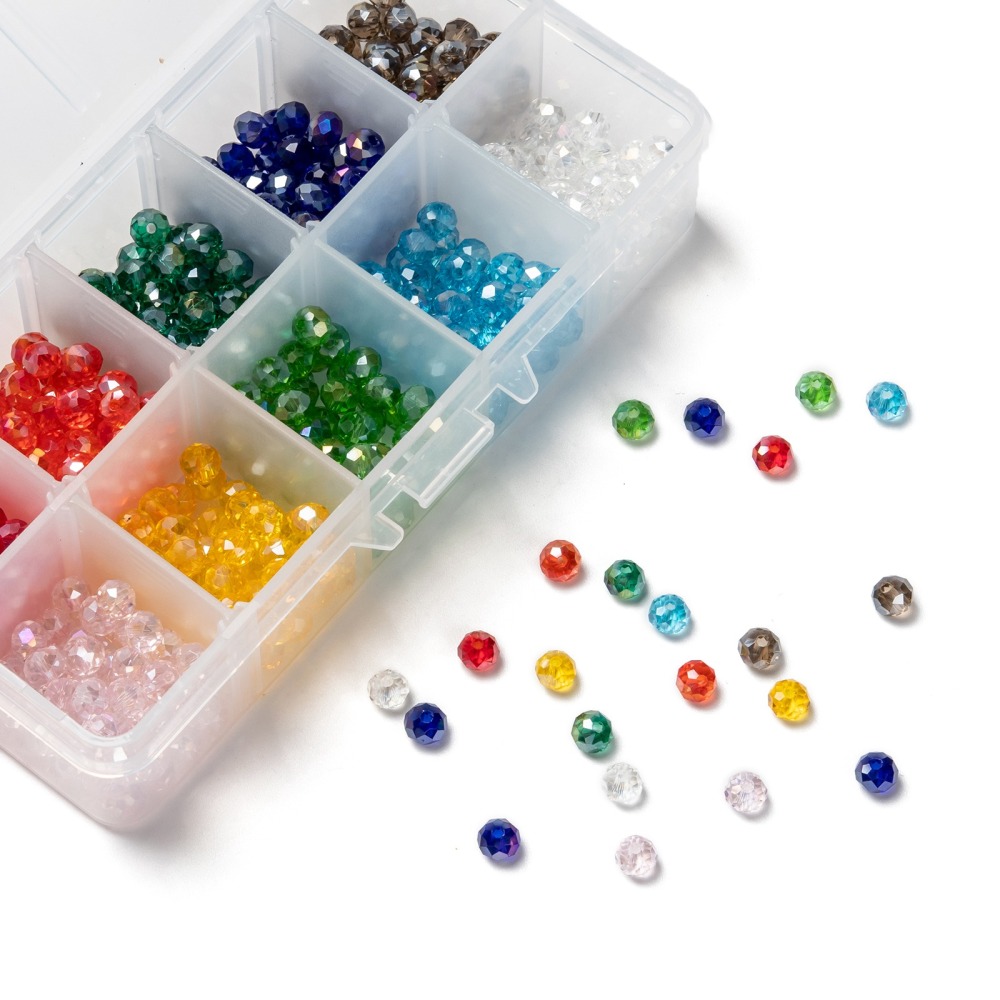 Kitul contine 10 culori a 50 buc. de cristale rondele 6x4 mm + cutie compatimentata